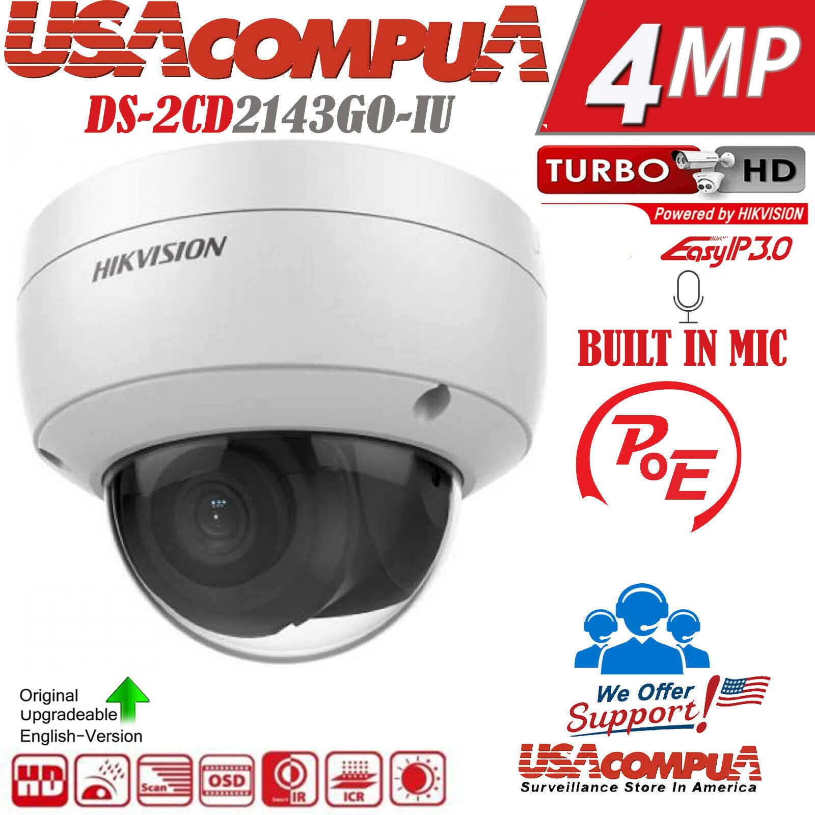 DS-2CD2143G0-IU Hikvision 4MP POE W/ audio H,265 ENGLISH (2.8mm) Built-In-Mic