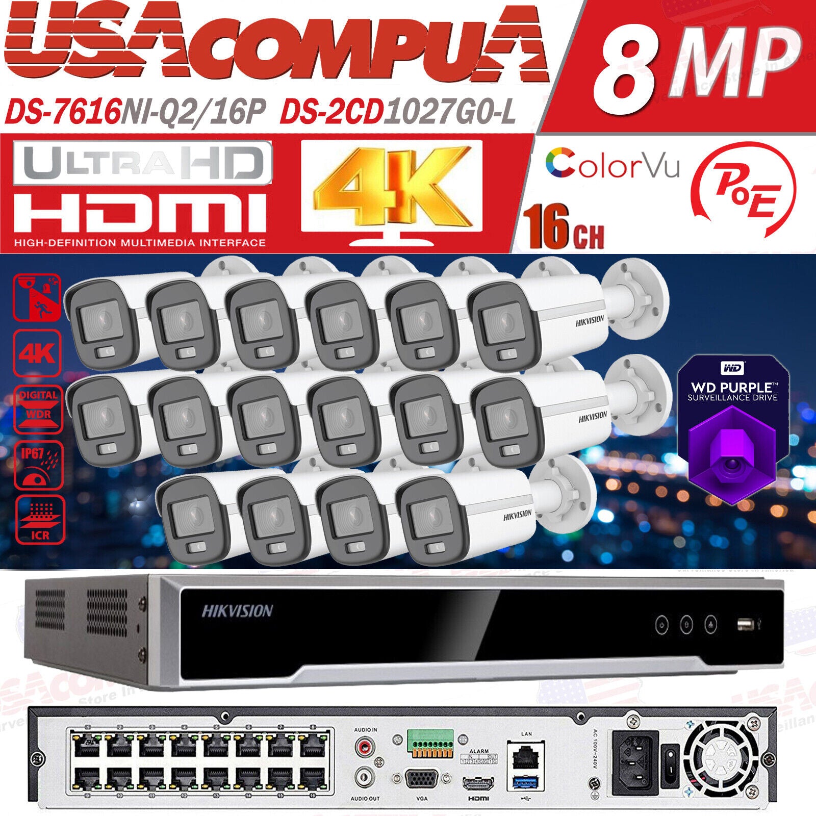 HIKVISION 16CH IP SECURITY SYSTEM COLORVU BULLET 2MP DOME / HDD DS-2CD1027G0-L