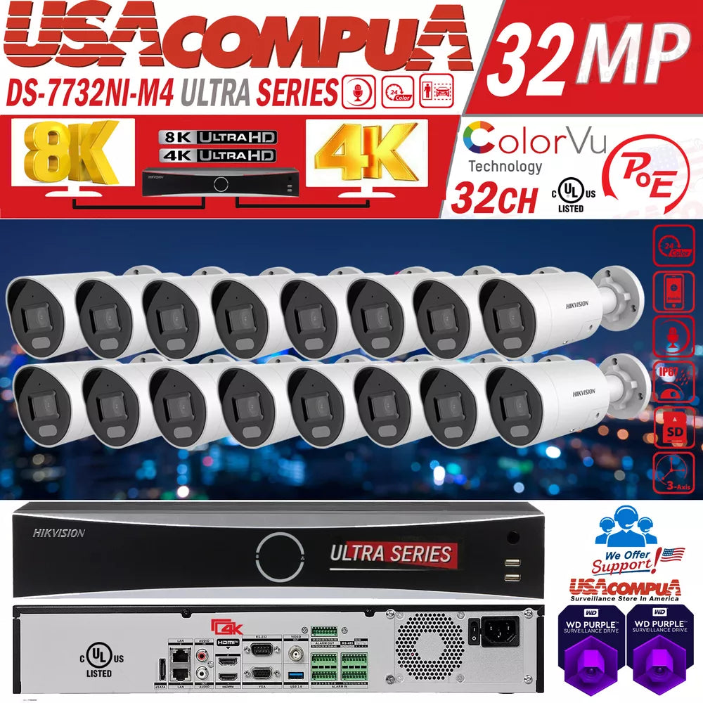 Hikvision 32CH NVR 8K 32MP 16POE Bullet 4MP Security Camera System W/Audio Lo